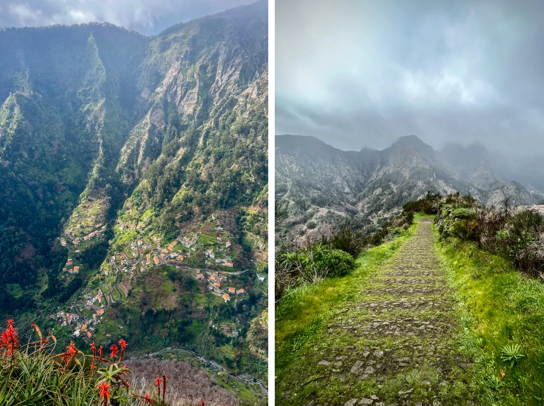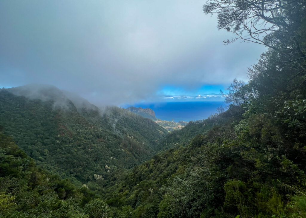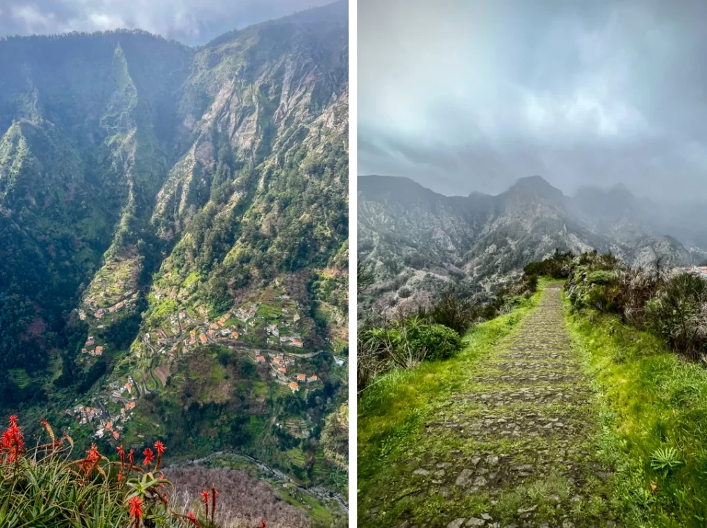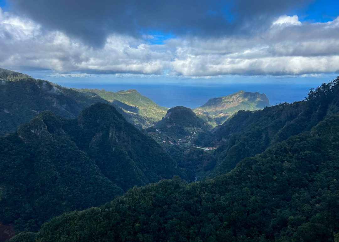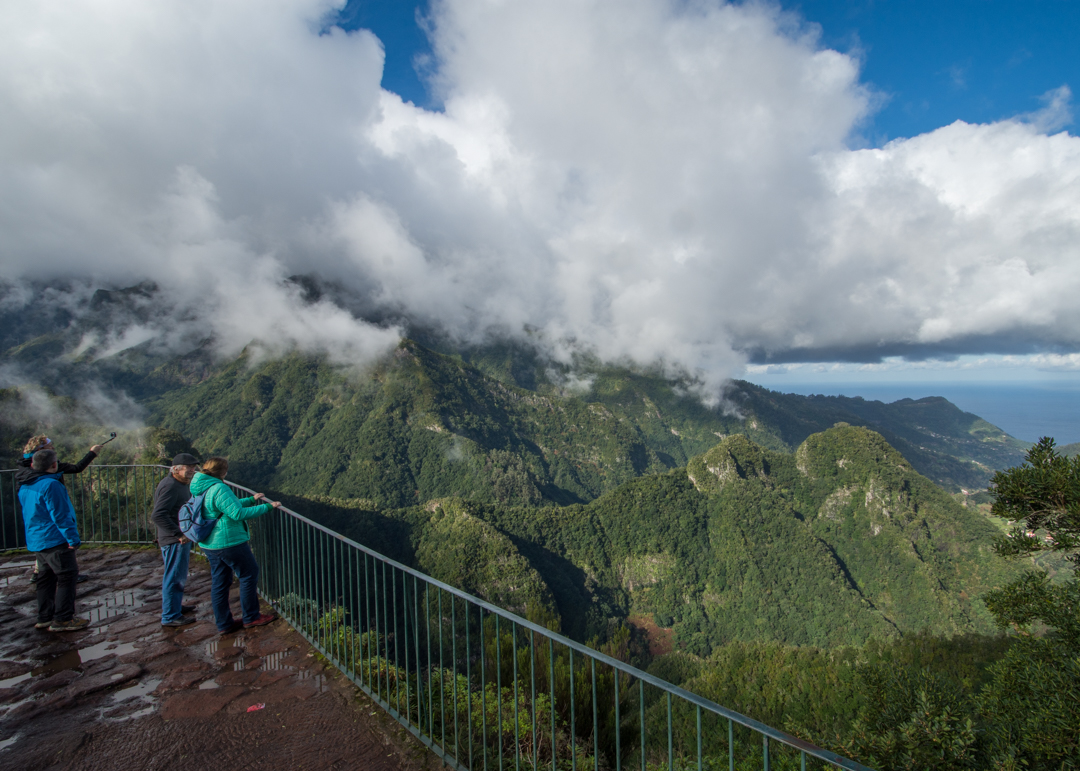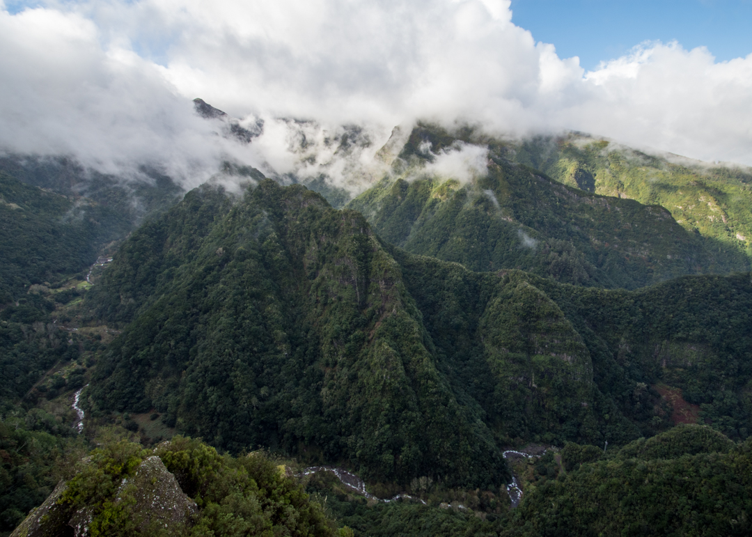 The Balcões viewpoint does not disappoint even if there are a few clouds…they just add to the dramatic topography. As you stand on a platform that seems suspended in mid-air, you’re treated to stupendous views across steep hillsides and deep ravines to the island’s highest peaks of Ruivo and Ariero.