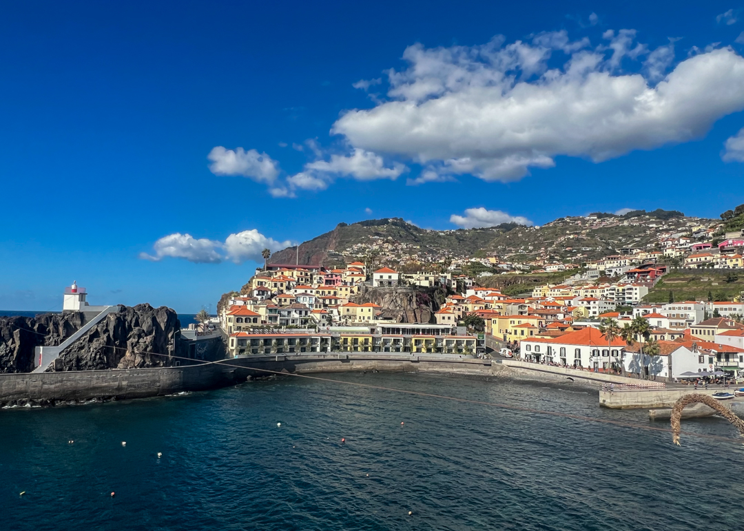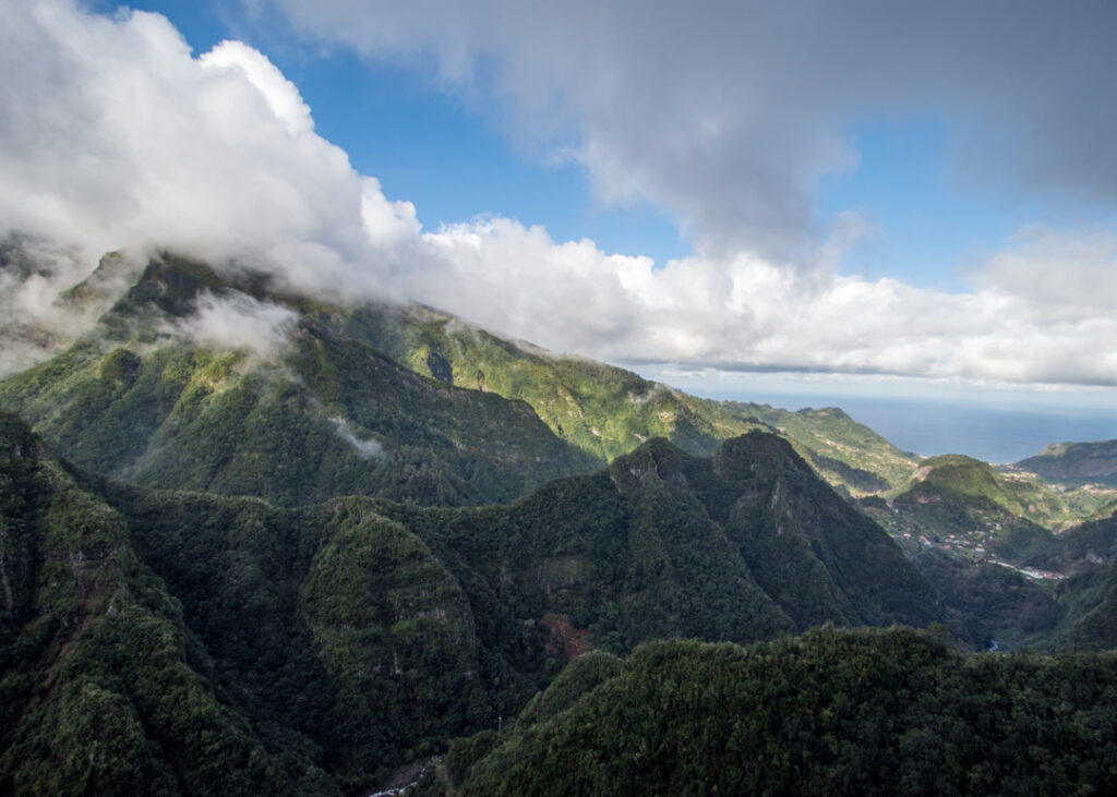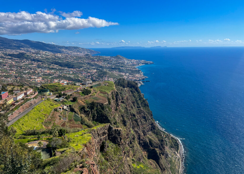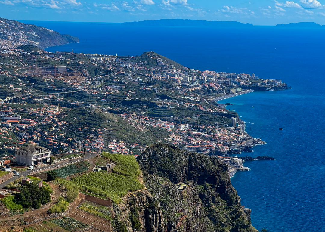 Green terraces and rural settlements fill the landscape all the way to Funchal, with Madeira’s Desertas Islands in the distance.