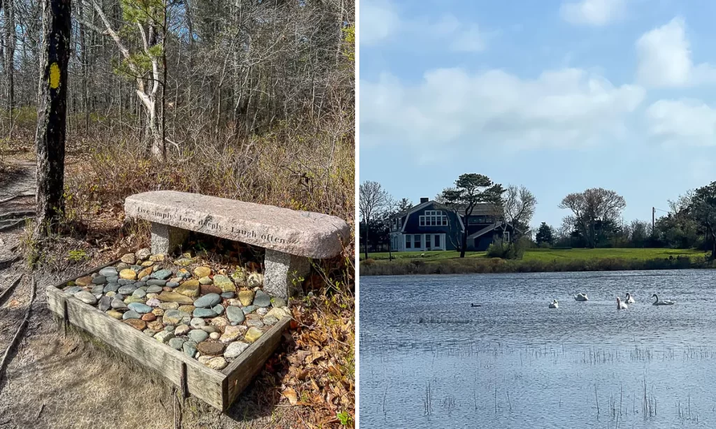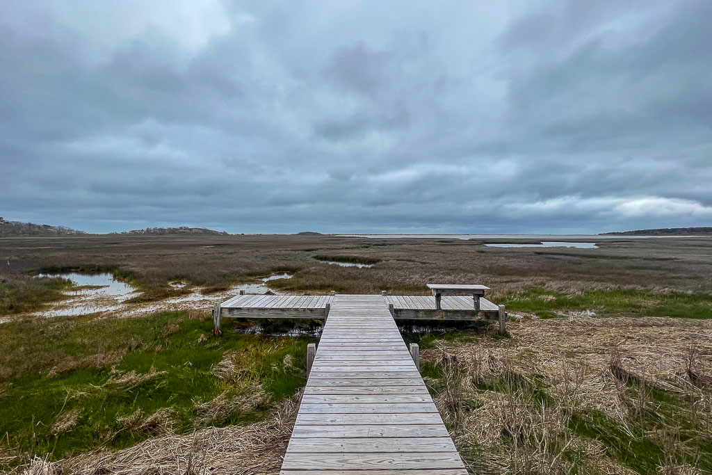 When you’ve had enough of the “city”, there are great green spaces a few minutes outside of Edgartown perfect for a post-lunch walk. The Caroline Tuthill Preserve is the first one you’ll come across and although wedged between a busy “highway” and housing developments, it’s incredibly peaceful and sheltered from all the busy activities. You can get a view of Sengekontacket Pond and the salt marsh that borders it and of a bench there to remind you of the most important things…
